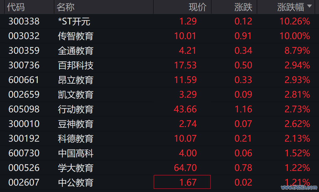 其次,教育板块领涨, 传智教育涨停,*ST开元、全通教育等个股涨幅居前。