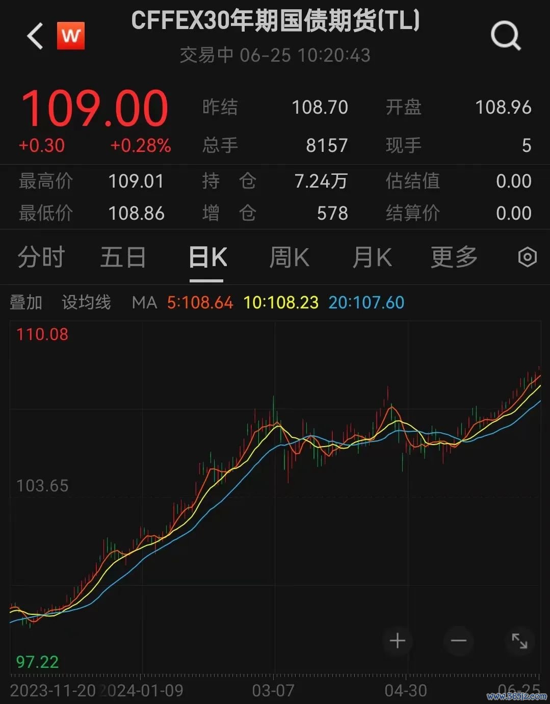 6月25日,国债期货开盘集体上涨。截至发稿,30年期主力合约涨0.28%报109元,10年期主力合约涨0.1%报105.145元,均为历史新高。