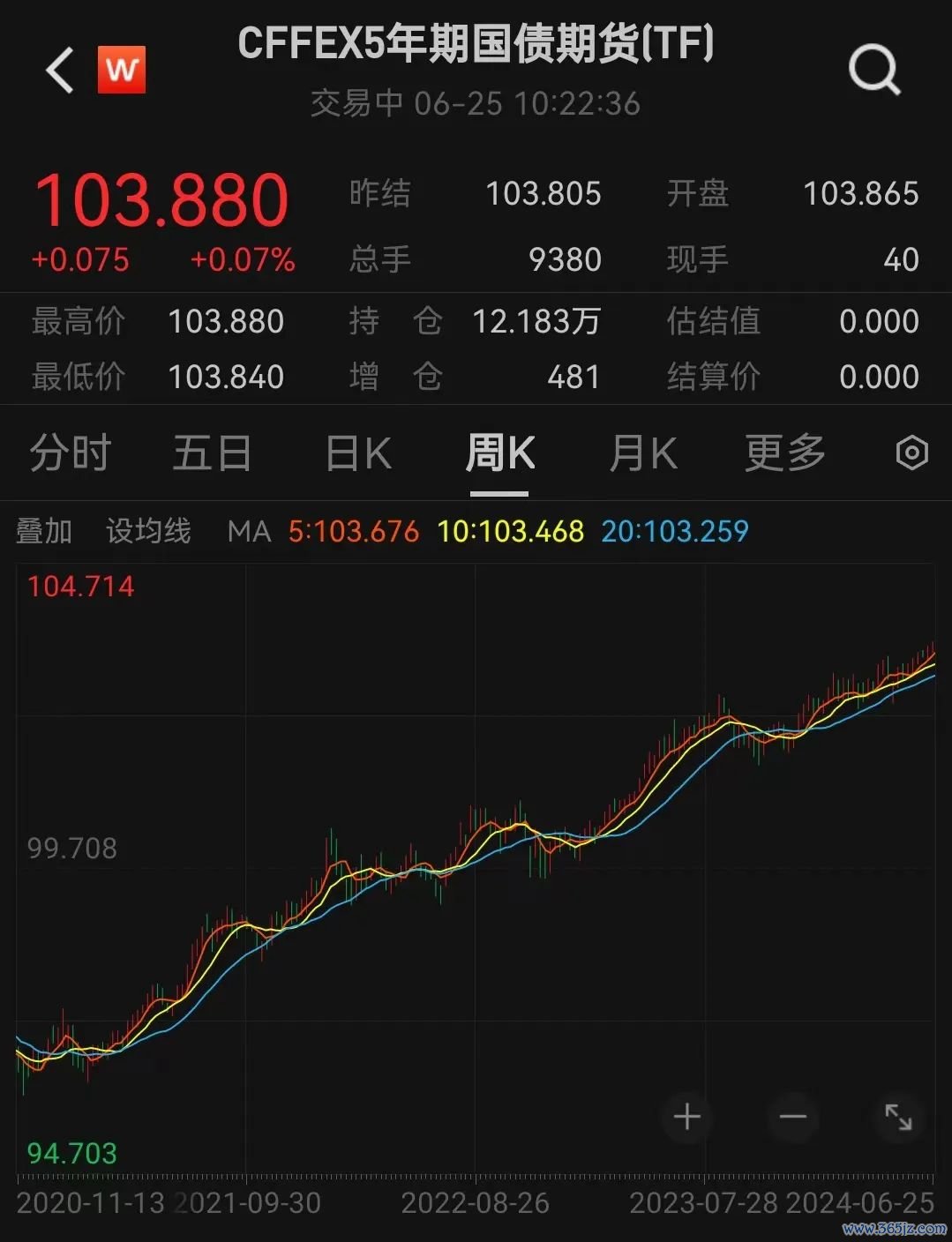 5年期主力合约涨0.07%报103.88元,为2020年5月中旬以来新高。
